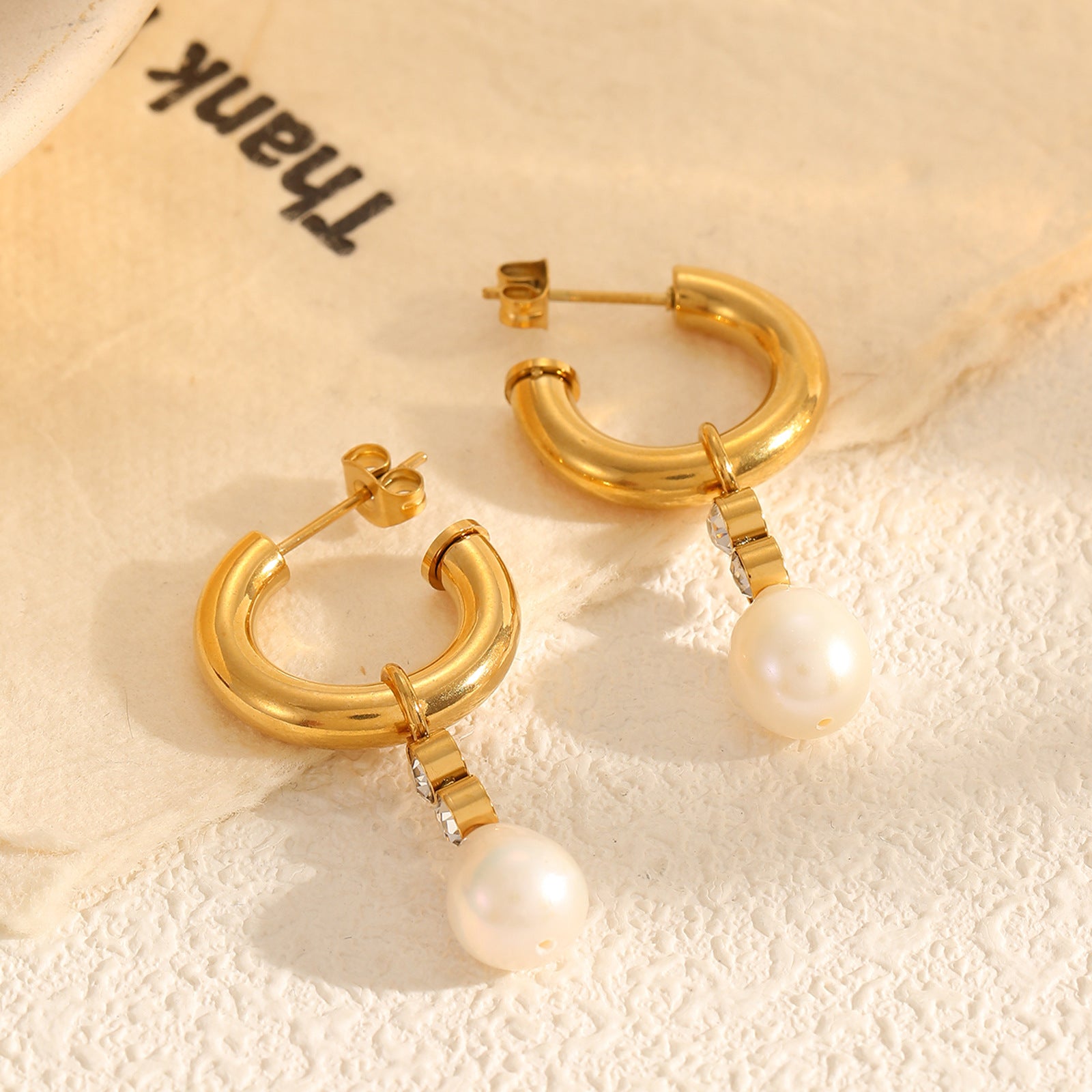 Fashionable niche light luxury temperament pearl earrings stainless steel plated 18K zircon pearl pendant earrings